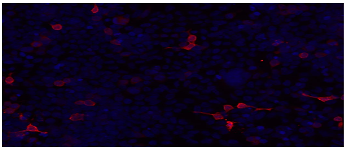 Fig.1 对透化处理的HEK293细胞进行免疫标记:红色荧光信号为胞内Kv1.2特异性标记(cat#75-008,稀释比例1:200),蓝色荧光为DAPI标记的细胞核。