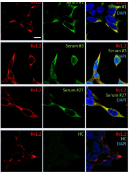 Fig3. 使用人血清样本1、3、27、健康对照(HC)血清及针对相应钾通道的商业抗体,对转染人Kv1.2的HEK293细胞进行结合实验。实验采用Kv1.2抗体(cat#75-008,稀释比1:200;红色荧光)标记转染细胞,患者血清结合情况通过抗人IgG-Cy3抗体(绿色荧光)显影。