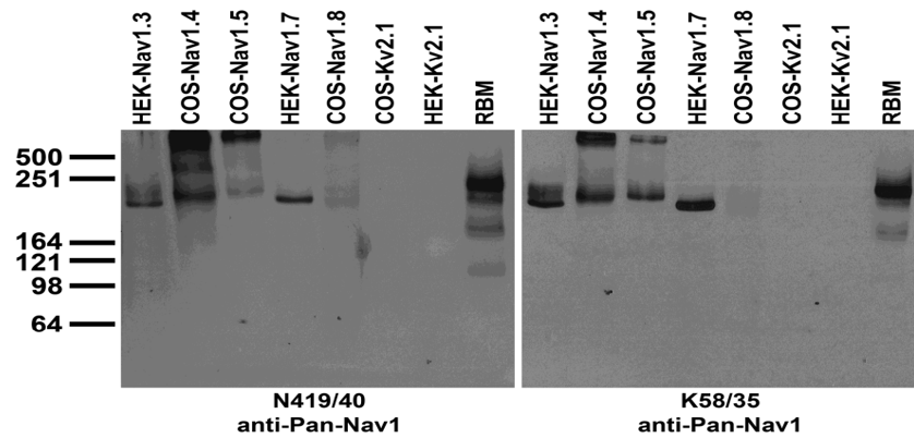 Fig.2用 N419/40(左图)或 K58/35(右图)的组织培养上清液作为探针,对以下样本进行免疫印迹分析:成年大鼠脑膜组分、以及瞬时或稳定表达不同未标记Nav1.X或Kv2.1质粒的COS或HEK细胞提取物。